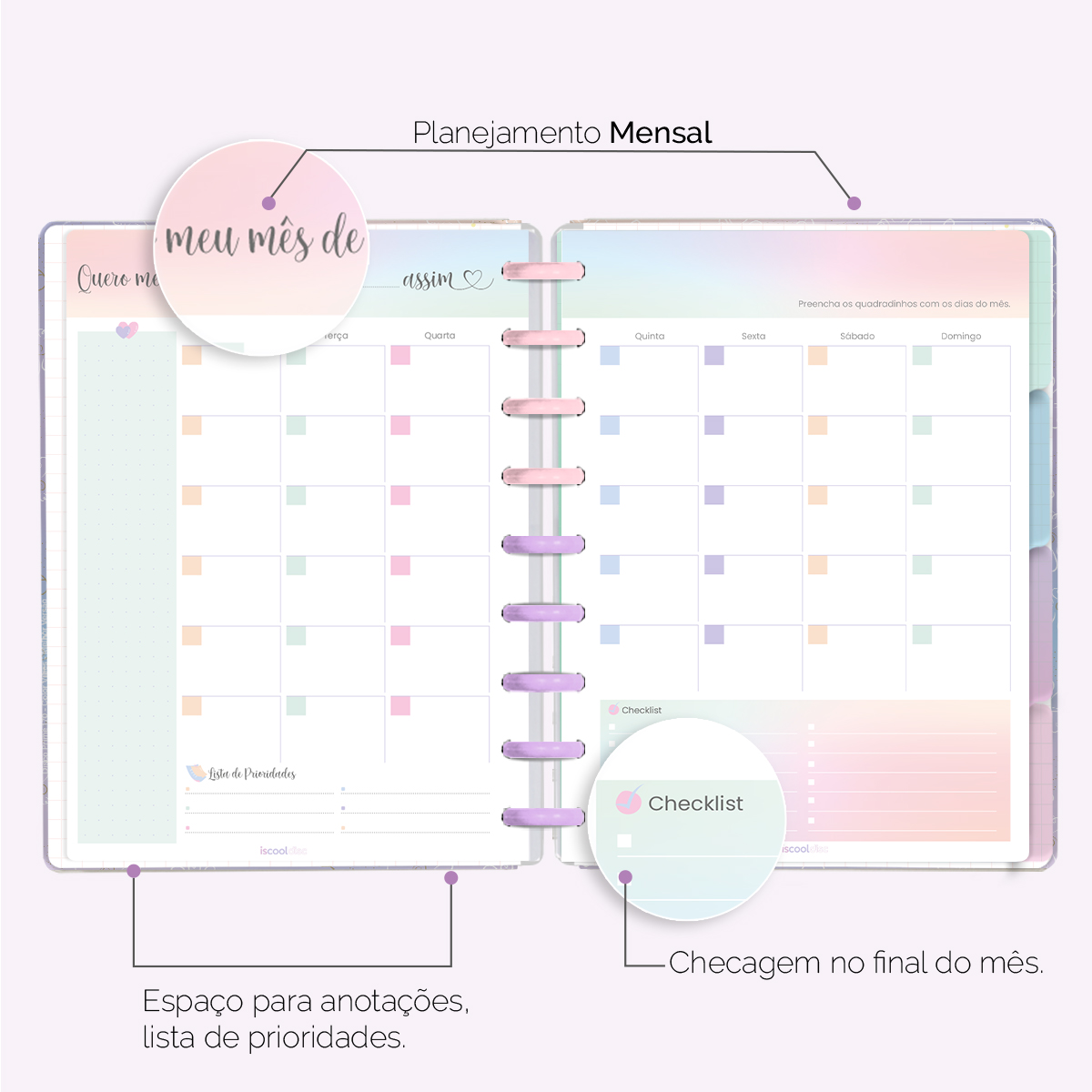 No início de cada mês, há um planejamento mensal, facilitando visualmente as suas principais anotações, um "Habit Tracker" para você desenvolver novos hábitos ou controlar os mais importantes, e ainda um planejamento financeiro, facilitando o controle das suas receitas e despesas, além de inúmeras outras funcionalidades.