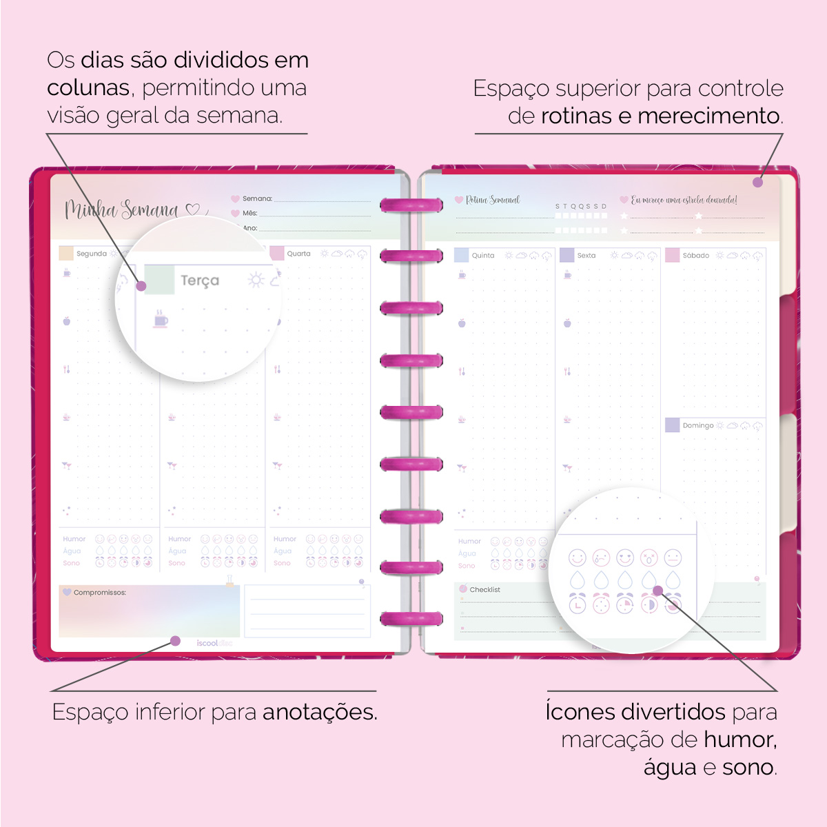 Os dias são divididos em colunas, permitindo uma visão geral da semana, onde você mesmo irá indicar o dia, a semana, o mês e o ano. Assim, você pode utilizar o seu planner independentemente do ano em que estivermos. Não é incrível?