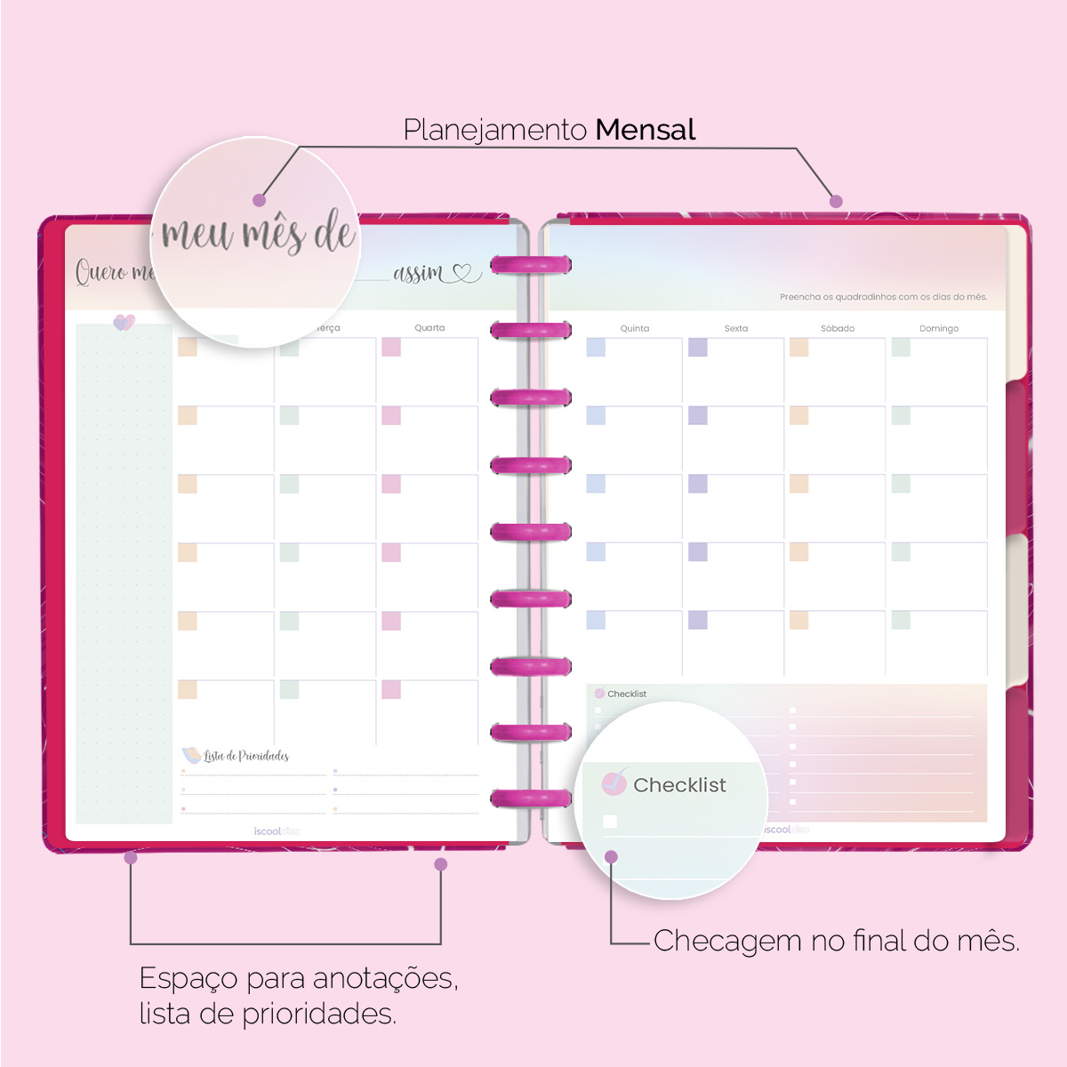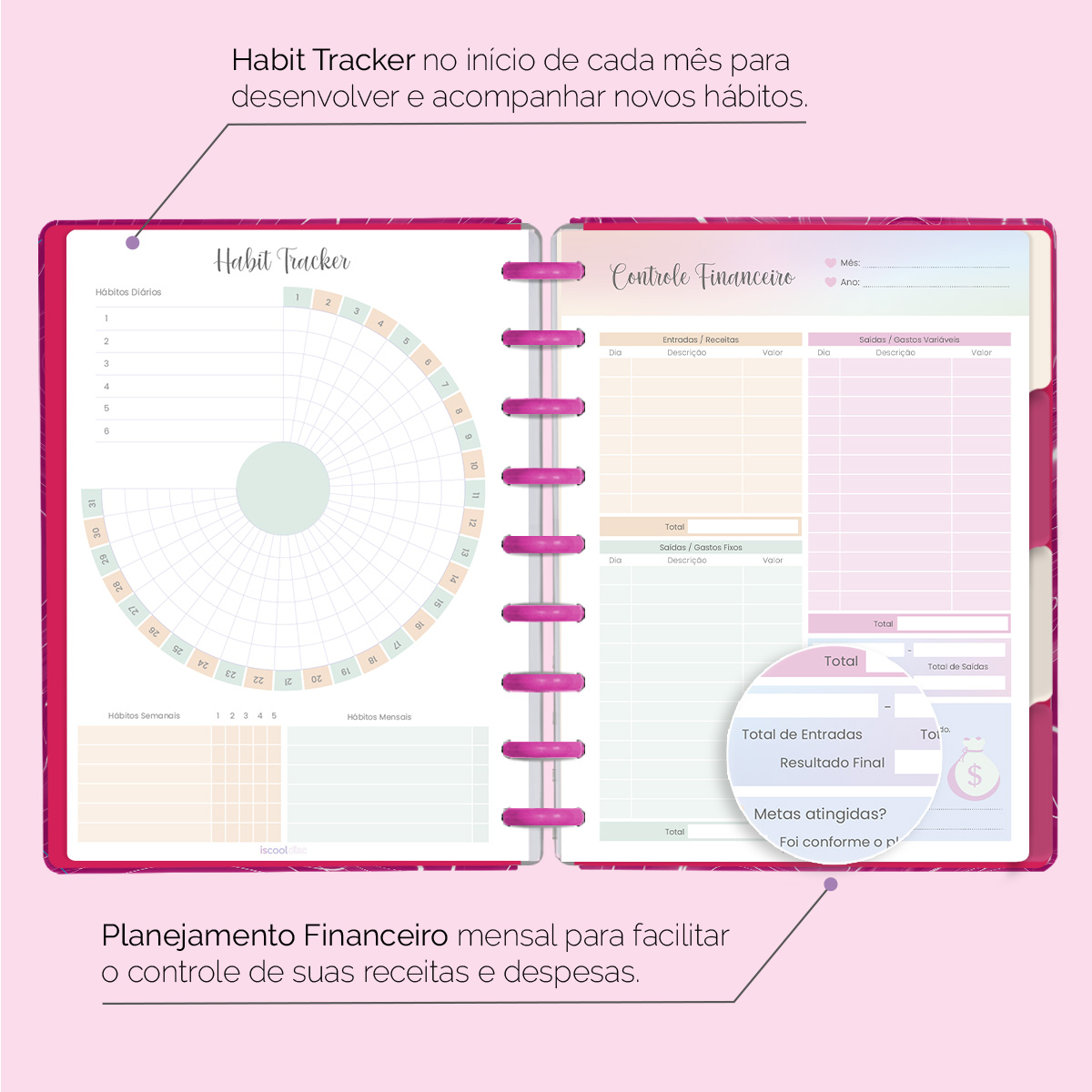No início de cada mês, há um planejamento mensal, facilitando visualmente as suas principais anotações, um "Habit Tracker" para você desenvolver novos hábitos ou controlar os mais importantes, e ainda um planejamento financeiro, facilitando o controle das suas receitas e despesas, além de inúmeras outras funcionalidades.