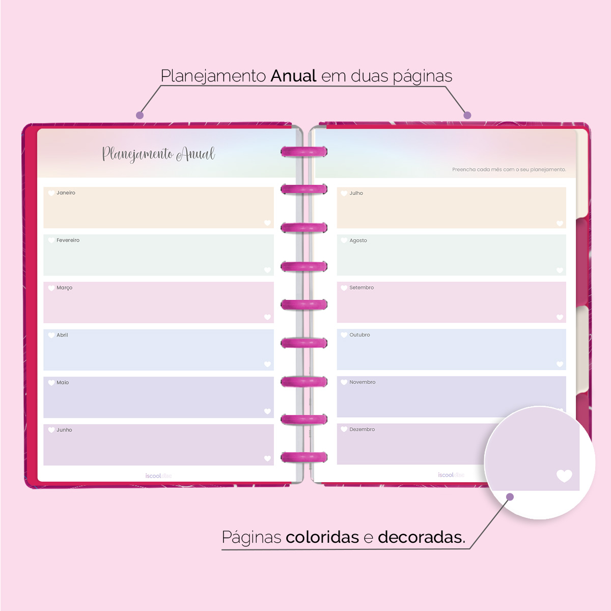 O ISCOOL DISC Planner Permanente foi criado especialmente para ajudar você a alcançar todas as suas metas e objetivos pessoais. É um planner totalmente customizável, no qual os elementos são reposicionáveis. Você pode montá-lo como preferir, deixando sua criatividade fluir livremente.