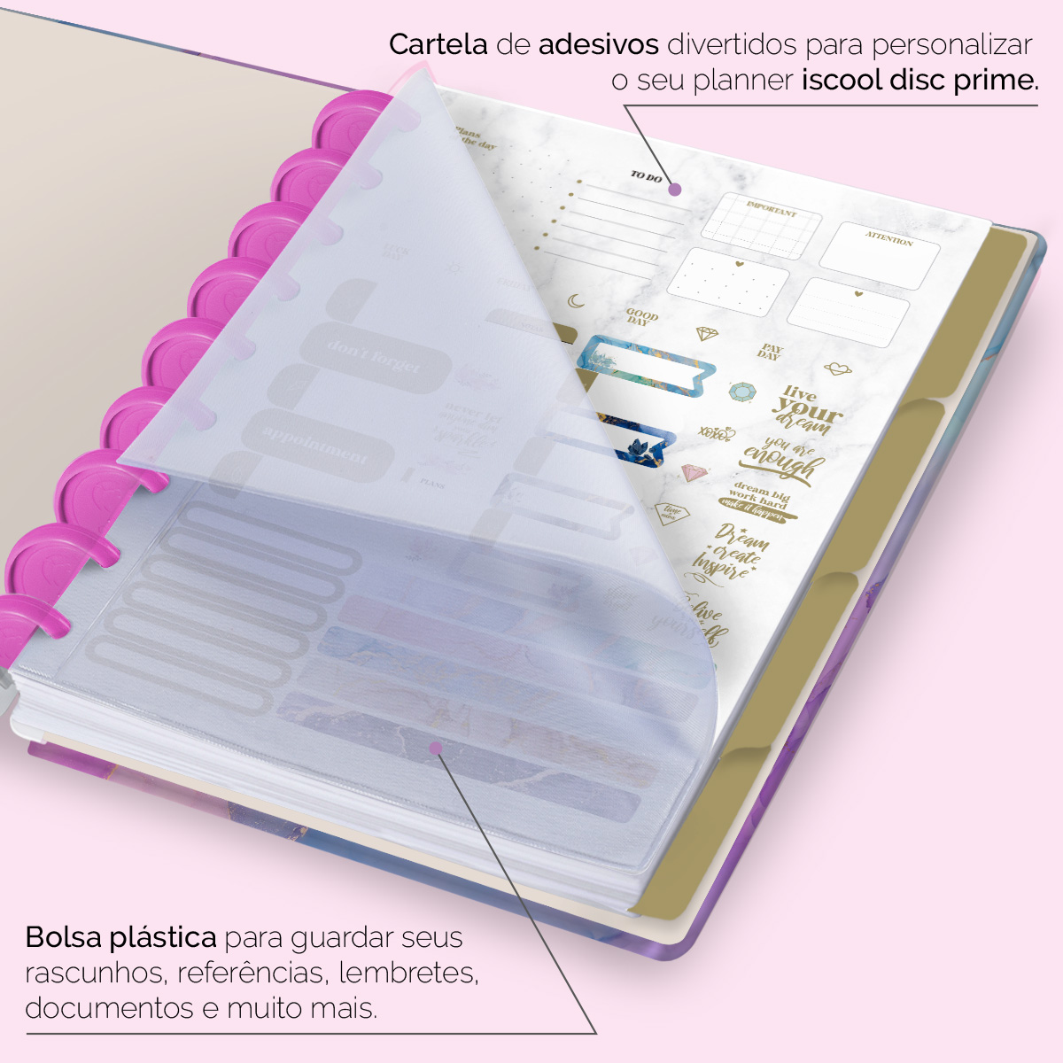 Além de tudo isso, o ISCOOL DISC Planner Permanente conta com detalhes que fazem toda a diferença: elástico para fechamento da capa, proporcionando muito mais estilo e privacidade para suas anotações; bolsa plástica para guardar seus rascunhos, referências, lembretes e documentos; e uma cartela de adesivos incríveis para que você possa personalizar o planner do seu jeitinho!