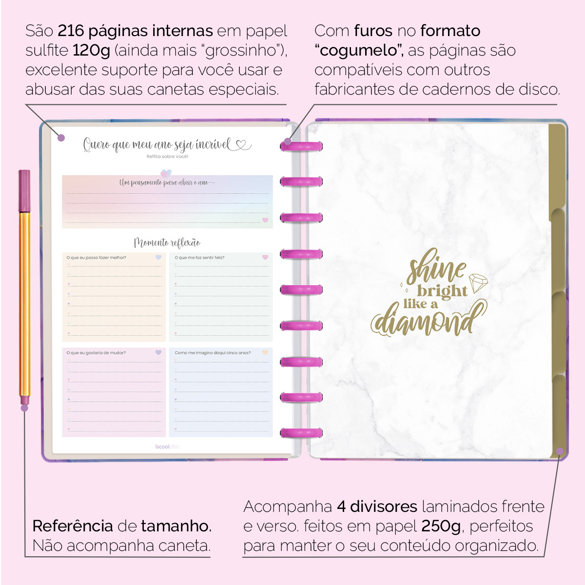 O miolo conta com páginas decoradas em papel sulfite 120g (aquele papel ainda mais "grossinho"), para que você use e abuse das suas canetas especiais. Com furos no formato de "cogumelo", você poderá dar um "up" nele com nossos refis, além de ser compatível com outros fabricantes de cadernos e planners de discos.