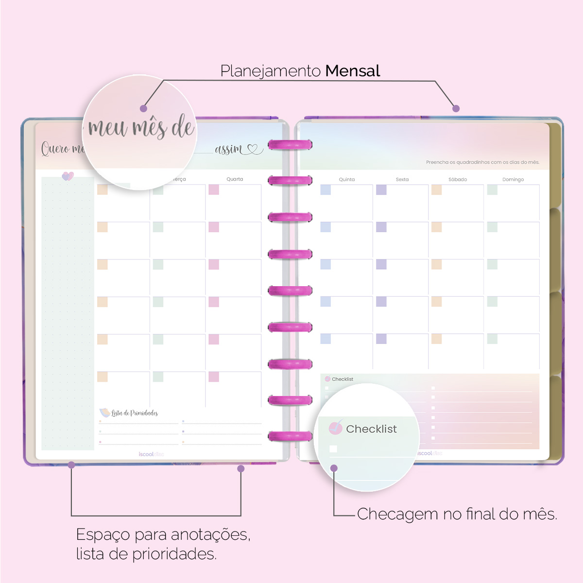 No início de cada mês, há um planejamento mensal, facilitando visualmente as suas principais anotações, um "Habit Tracker" para você desenvolver novos hábitos ou controlar os mais importantes, e ainda um planejamento financeiro, facilitando o controle das suas receitas e despesas, além de inúmeras outras funcionalidades.