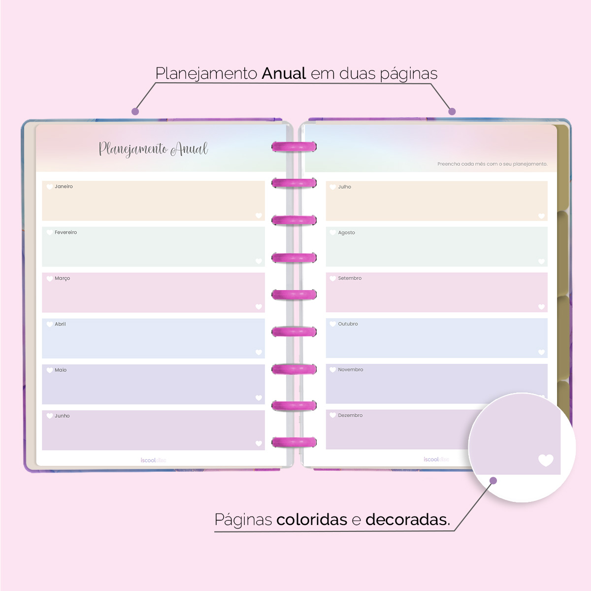 O ISCOOL DISC Planner Permanente foi criado especialmente para ajudar você a alcançar todas as suas metas e objetivos pessoais. É um planner totalmente customizável, no qual os elementos são reposicionáveis. Você pode montá-lo como preferir, deixando sua criatividade fluir livremente.