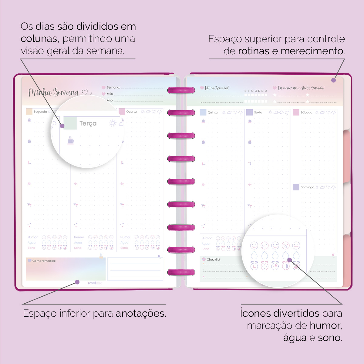 Os dias são divididos em colunas, permitindo uma visão geral da semana, onde você mesmo irá indicar o dia, a semana, o mês e o ano. Assim, você pode utilizar o seu planner independentemente do ano em que estivermos. Não é incrível?