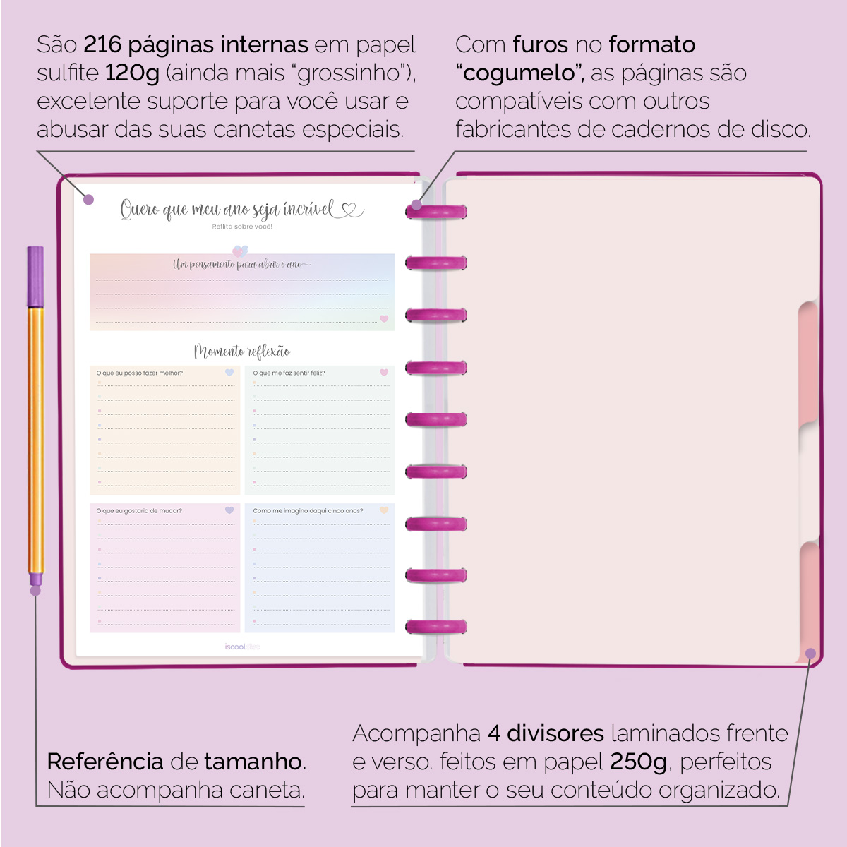 Além de tudo isso, o ISCOOL DISC Planner Permanente conta com detalhes que fazem toda a diferença: elástico para fechamento da capa, proporcionando muito mais estilo e privacidade para suas anotações; bolsa plástica para guardar seus rascunhos, referências, lembretes e documentos; e uma cartela de adesivos incríveis para que você possa personalizar o planner do seu jeitinho!