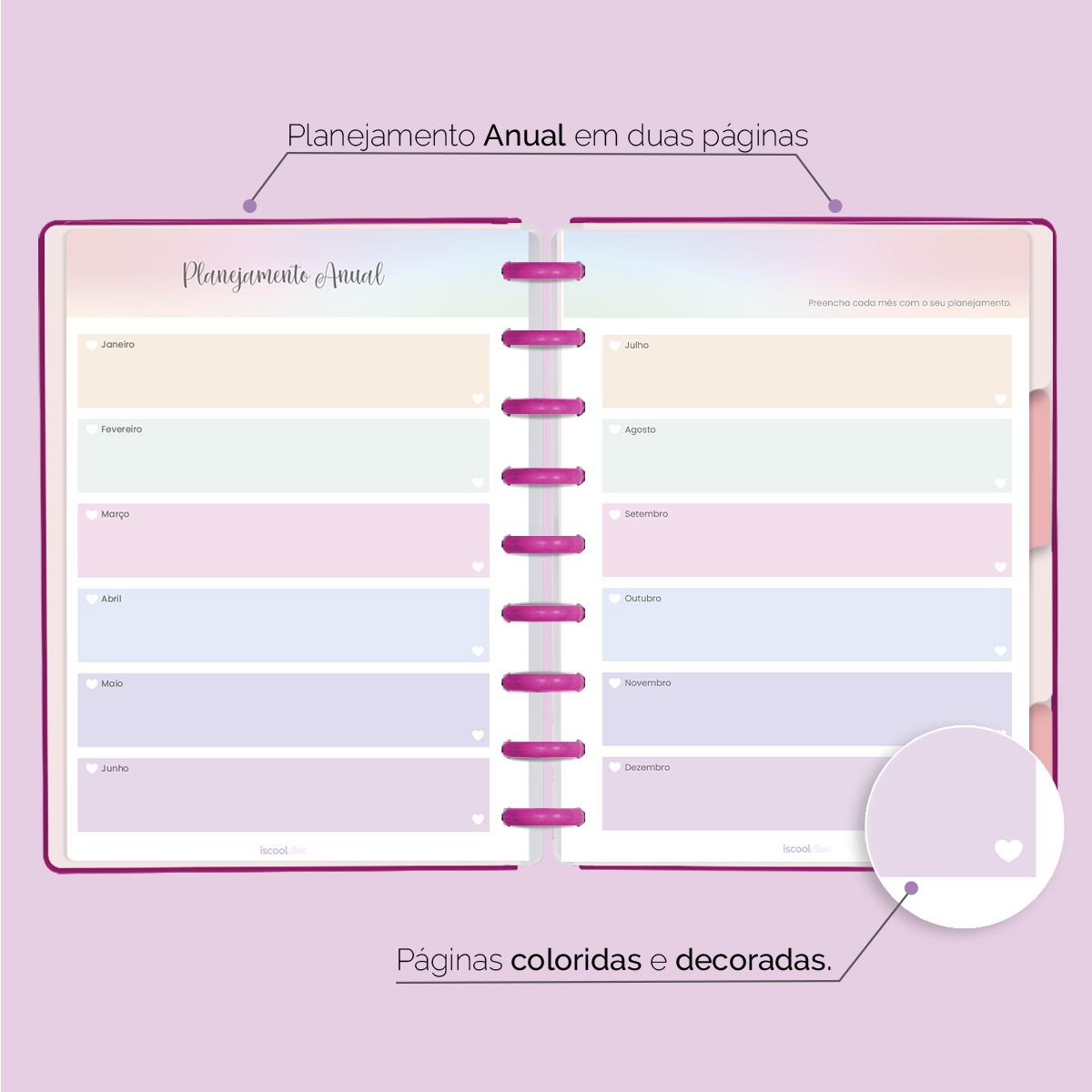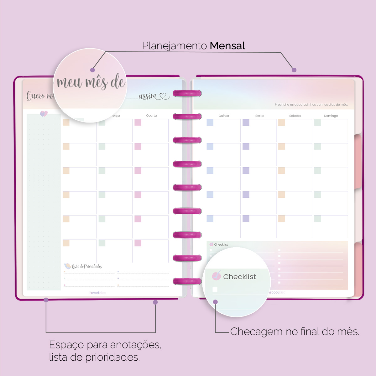 O ISCOOL DISC Planner Permanente foi criado especialmente para ajudar você a alcançar todas as suas metas e objetivos pessoais. É um planner totalmente customizável, no qual os elementos são reposicionáveis. Você pode montá-lo como preferir, deixando sua criatividade fluir livremente.