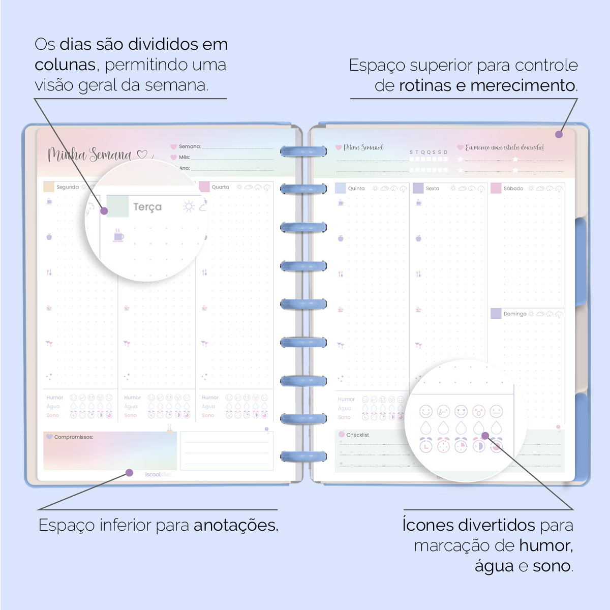 Os dias são divididos em colunas, permitindo uma visão geral da semana, onde você mesmo irá indicar o dia, a semana, o mês e o ano. Assim, você pode utilizar o seu planner independentemente do ano em que estivermos. Não é incrível?
