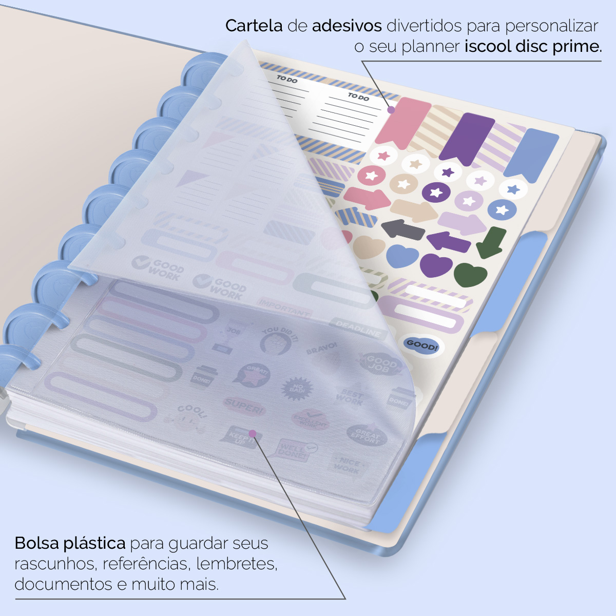 Além de tudo isso, o ISCOOL DISC Planner Permanente conta com detalhes que fazem toda a diferença: elástico para fechamento da capa, proporcionando muito mais estilo e privacidade para suas anotações; bolsa plástica para guardar seus rascunhos, referências, lembretes e documentos; e uma cartela de adesivos incríveis para que você possa personalizar o planner do seu jeitinho!