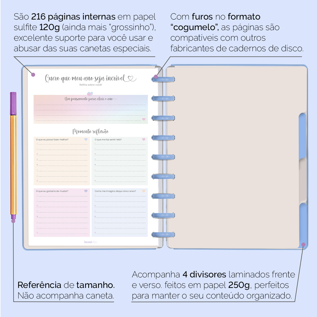 O miolo conta com páginas decoradas em papel sulfite 120g (aquele papel ainda mais "grossinho"), para que você use e abuse das suas canetas especiais. Com furos no formato de "cogumelo", você poderá dar um "up" nele com nossos refis, além de ser compatível com outros fabricantes de cadernos e planners de discos.