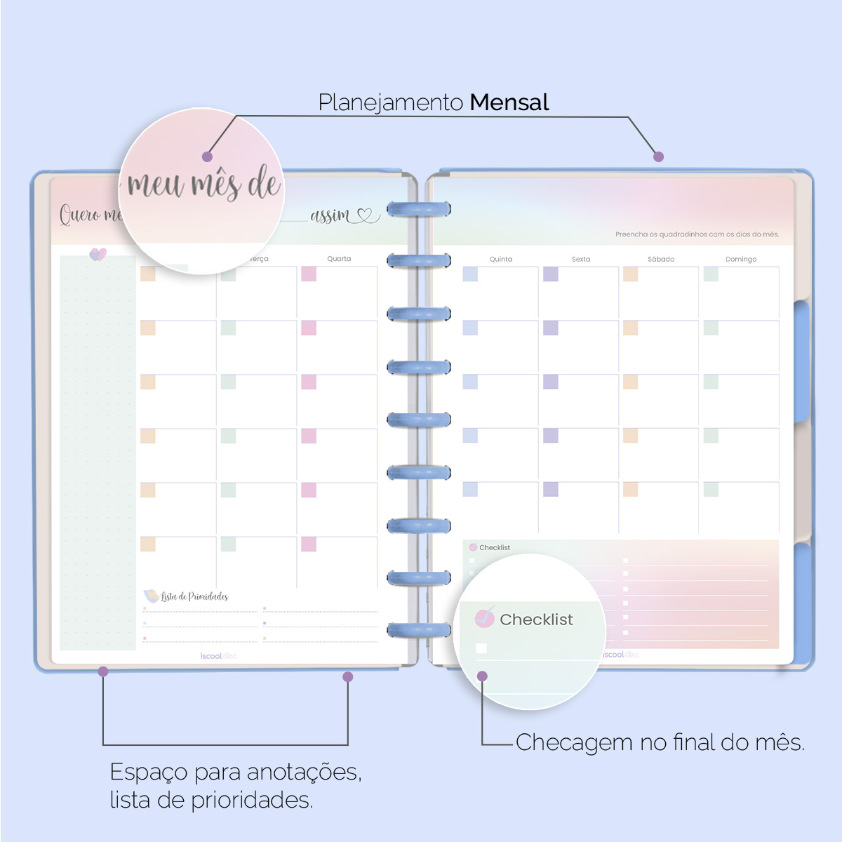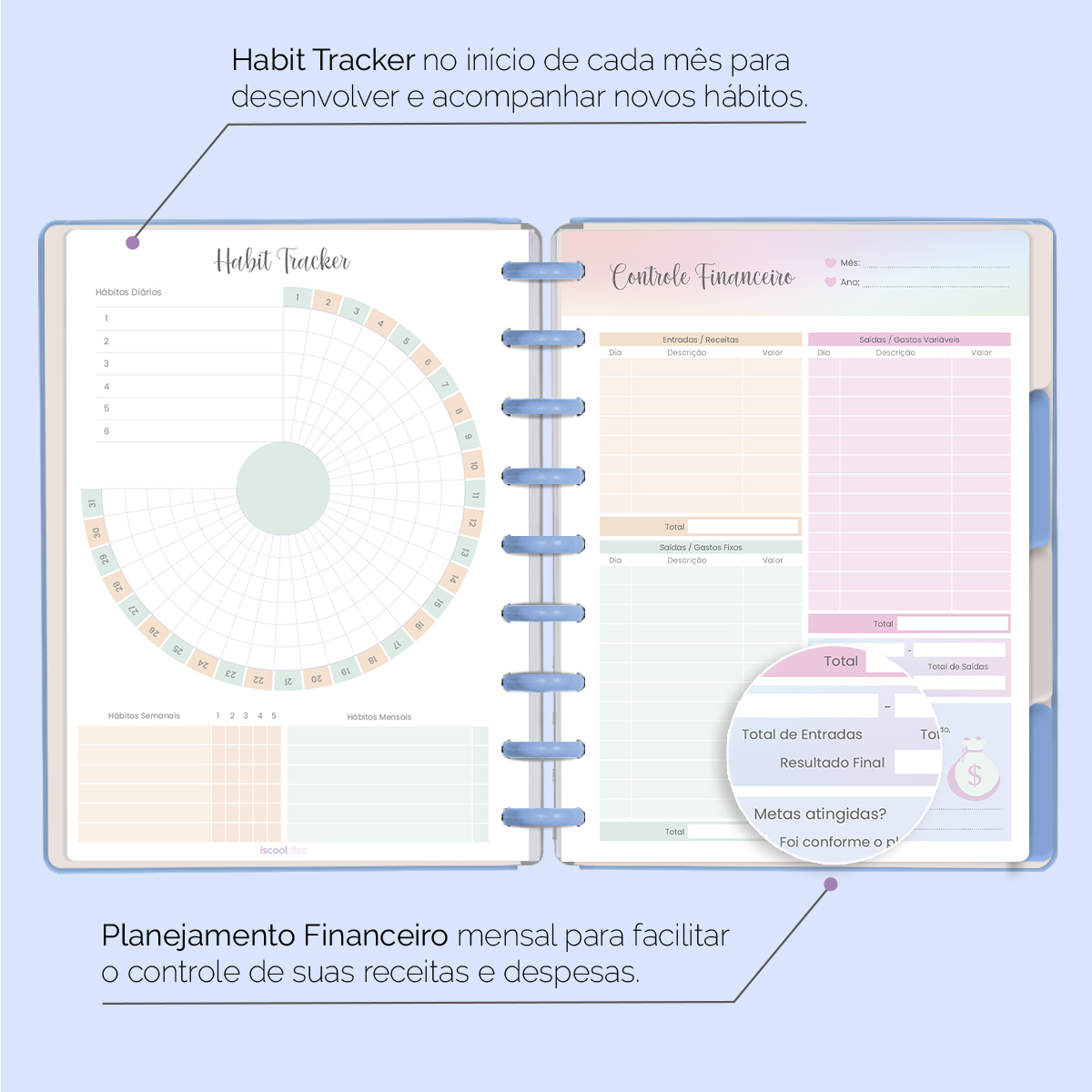 No início de cada mês, há um planejamento mensal, facilitando visualmente as suas principais anotações, um "Habit Tracker" para você desenvolver novos hábitos ou controlar os mais importantes, e ainda um planejamento financeiro, facilitando o controle das suas receitas e despesas, além de inúmeras outras funcionalidades.