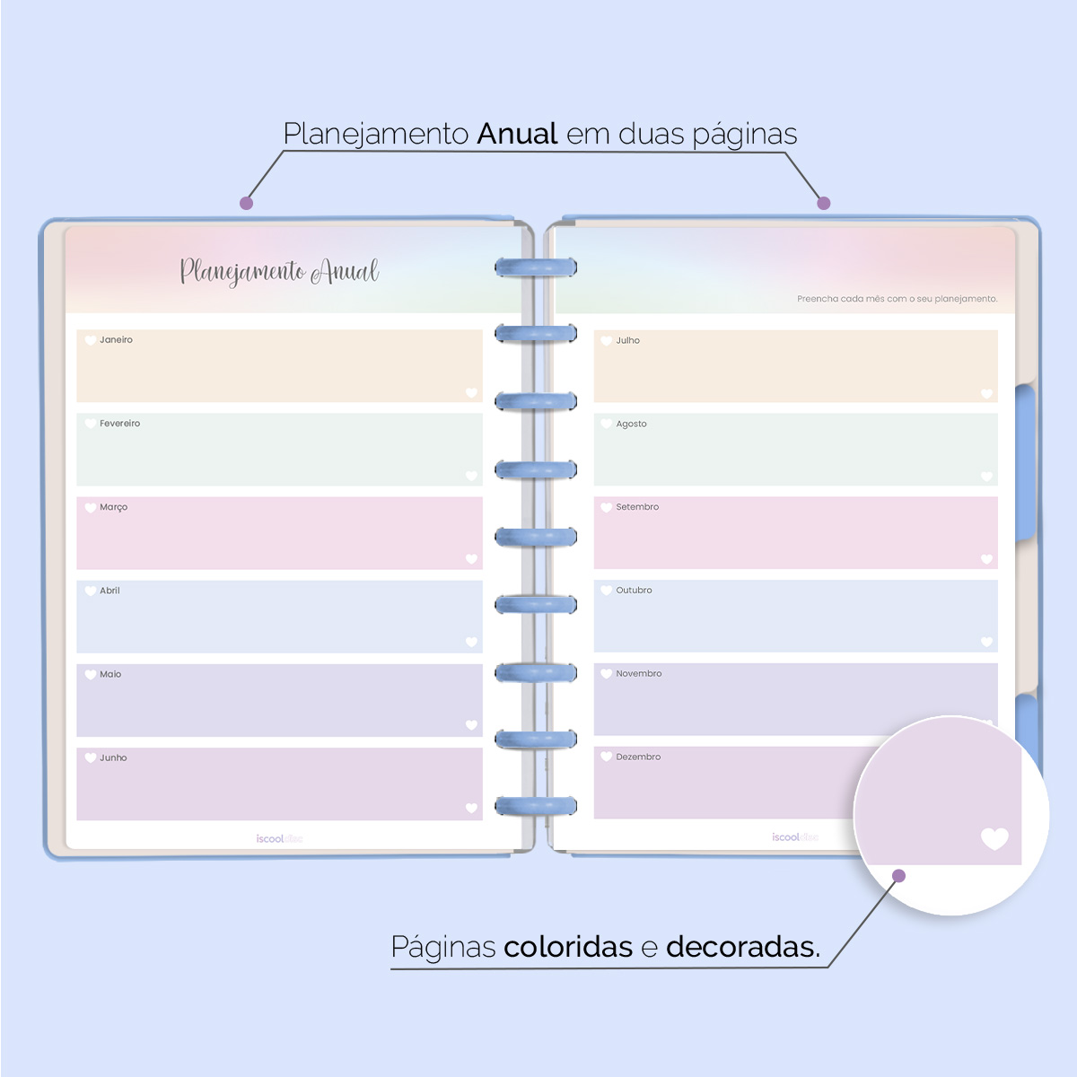 O ISCOOL DISC Planner Permanente foi criado especialmente para ajudar você a alcançar todas as suas metas e objetivos pessoais. É um planner totalmente customizável, no qual os elementos são reposicionáveis. Você pode montá-lo como preferir, deixando sua criatividade fluir livremente.