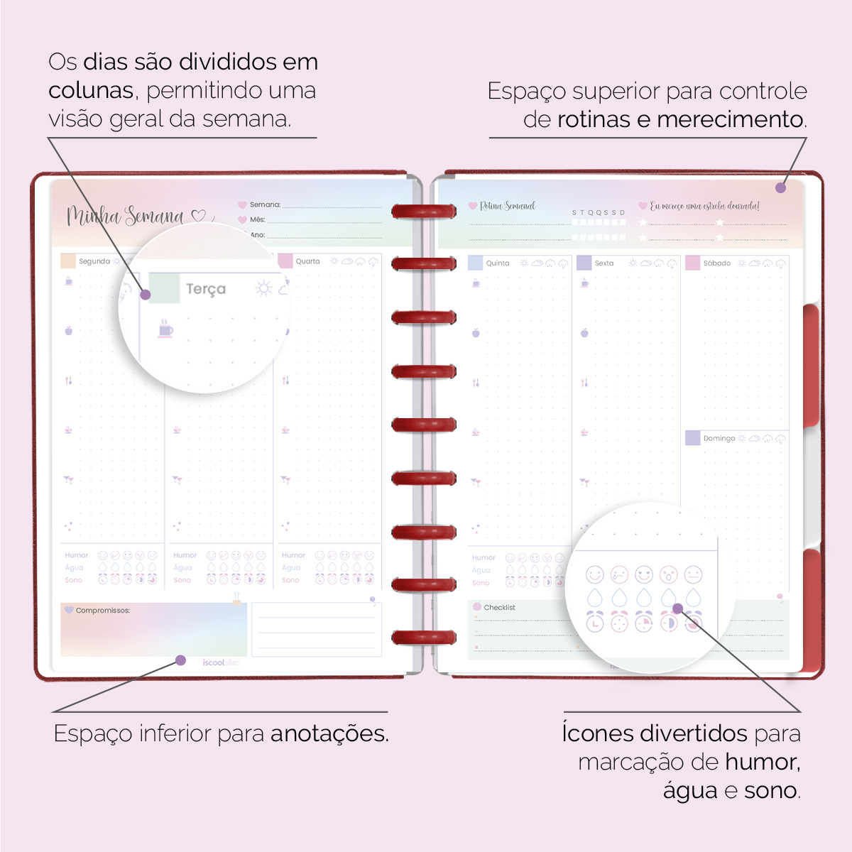 Os dias são divididos em colunas, permitindo uma visão geral da semana, onde você mesmo irá indicar o dia, a semana, o mês e o ano. Assim, você pode utilizar o seu planner independentemente do ano em que estivermos. Não é incrível?