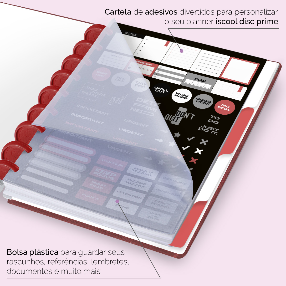 Além de tudo isso, o ISCOOL DISC Planner Permanente conta com detalhes que fazem toda a diferença: elástico para fechamento da capa, proporcionando muito mais estilo e privacidade para suas anotações; bolsa plástica para guardar seus rascunhos, referências, lembretes e documentos; e uma cartela de adesivos incríveis para que você possa personalizar o planner do seu jeitinho!