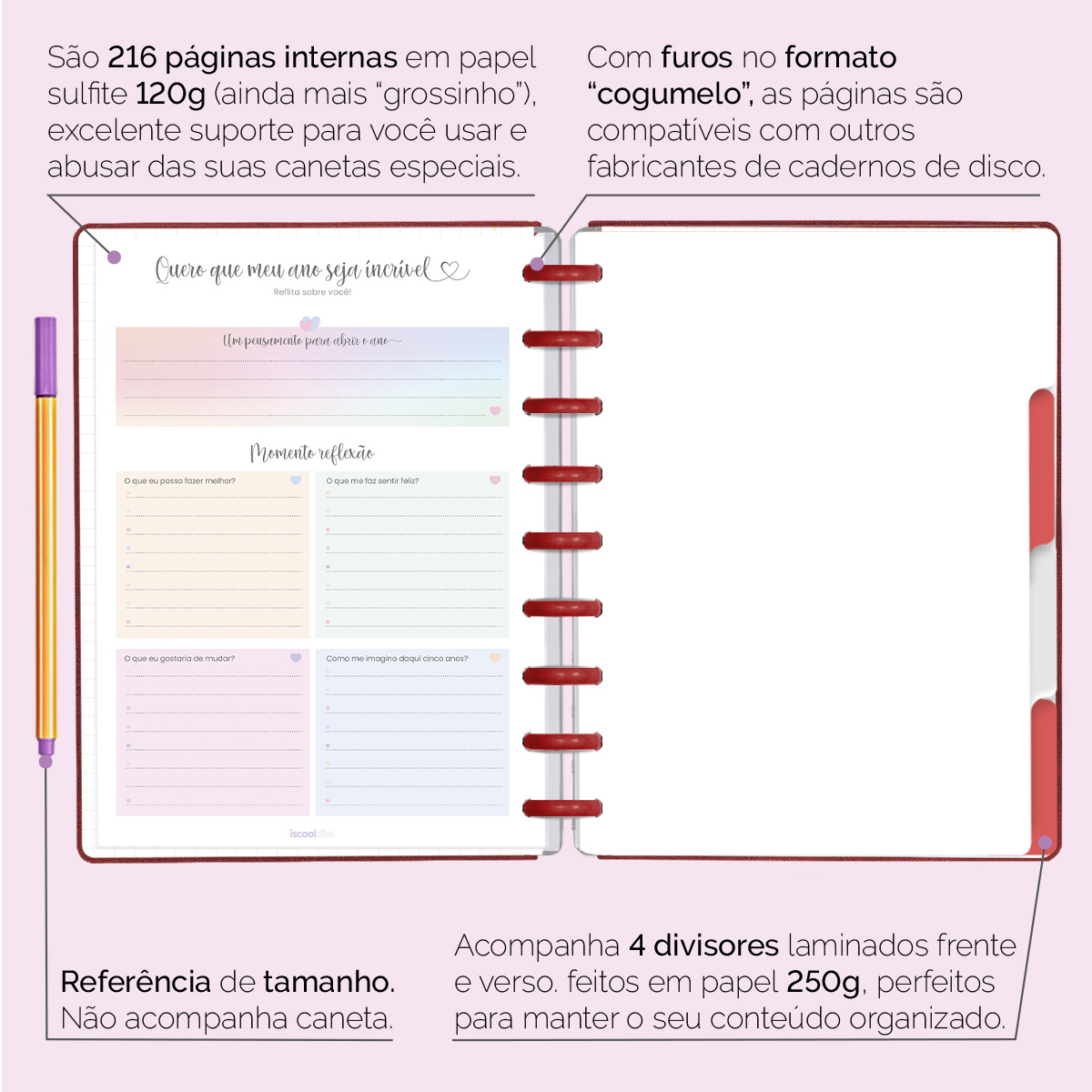 O miolo conta com páginas decoradas em papel sulfite 120g (aquele papel ainda mais "grossinho"), para que você use e abuse das suas canetas especiais. Com furos no formato de "cogumelo", você poderá dar um "up" nele com nossos refis, além de ser compatível com outros fabricantes de cadernos e planners de discos.