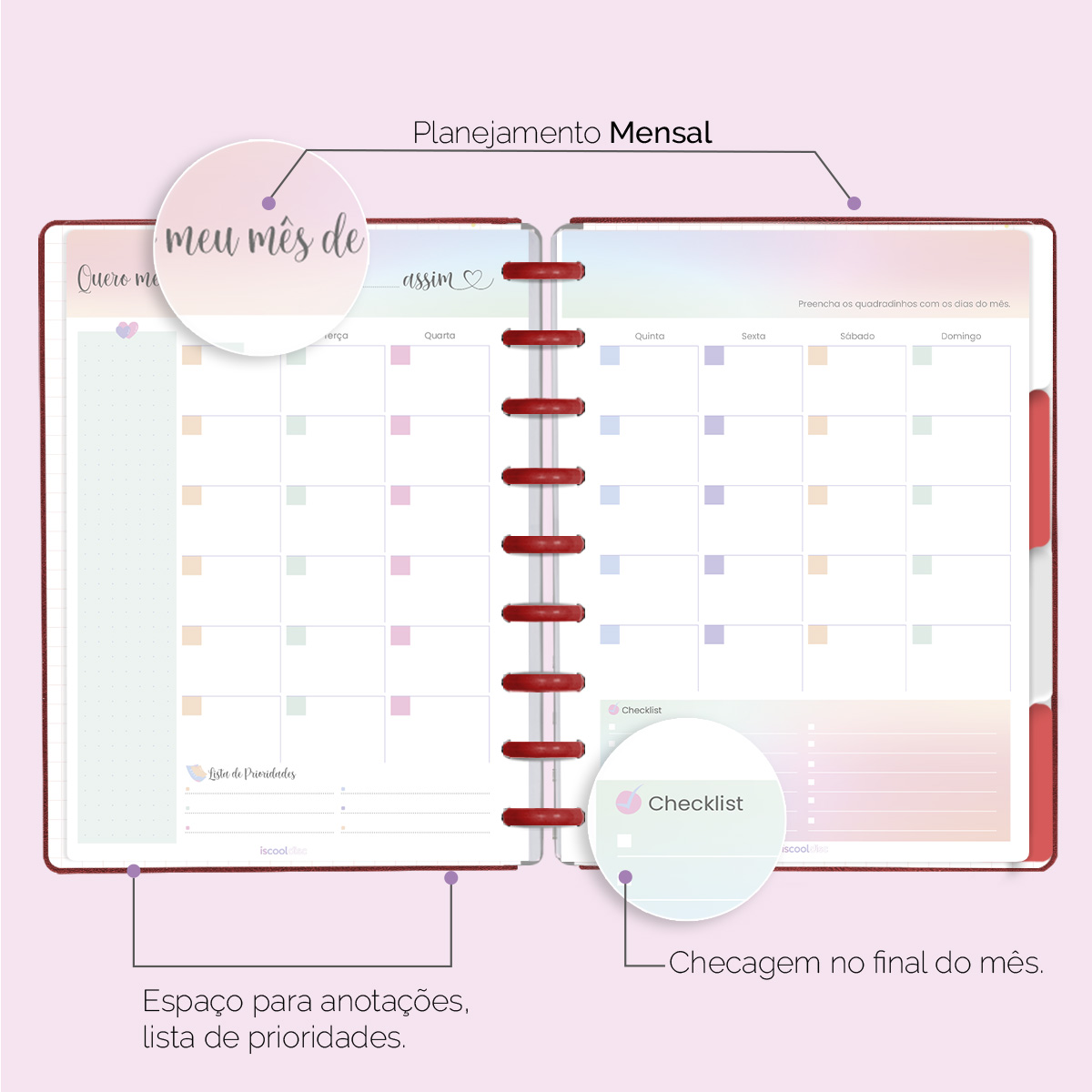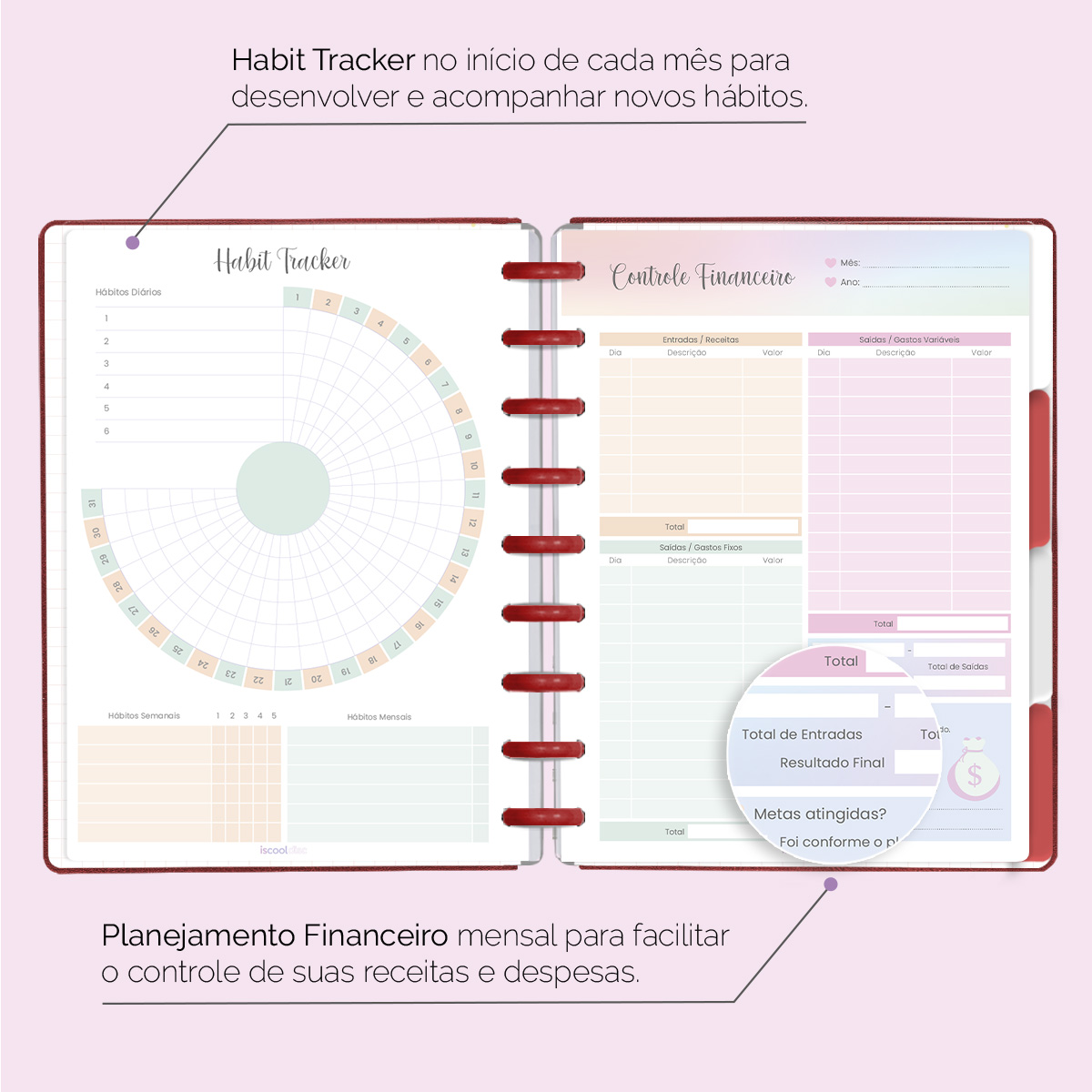 No início de cada mês, há um planejamento mensal, facilitando visualmente as suas principais anotações, um "Habit Tracker" para você desenvolver novos hábitos ou controlar os mais importantes, e ainda um planejamento financeiro, facilitando o controle das suas receitas e despesas, além de inúmeras outras funcionalidades.