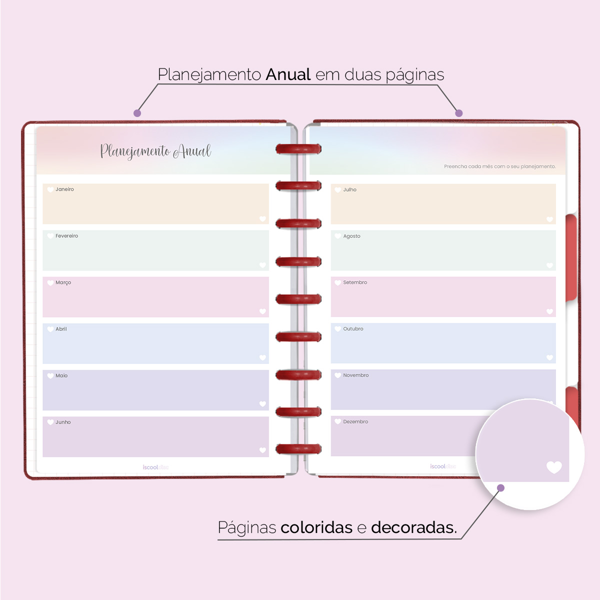 O ISCOOL DISC Planner Permanente foi criado especialmente para ajudar você a alcançar todas as suas metas e objetivos pessoais. É um planner totalmente customizável, no qual os elementos são reposicionáveis. Você pode montá-lo como preferir, deixando sua criatividade fluir livremente.