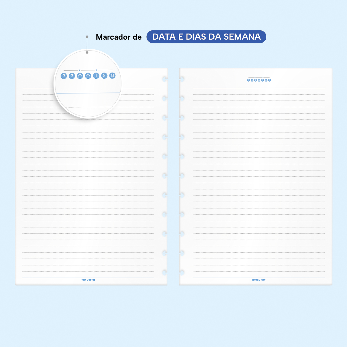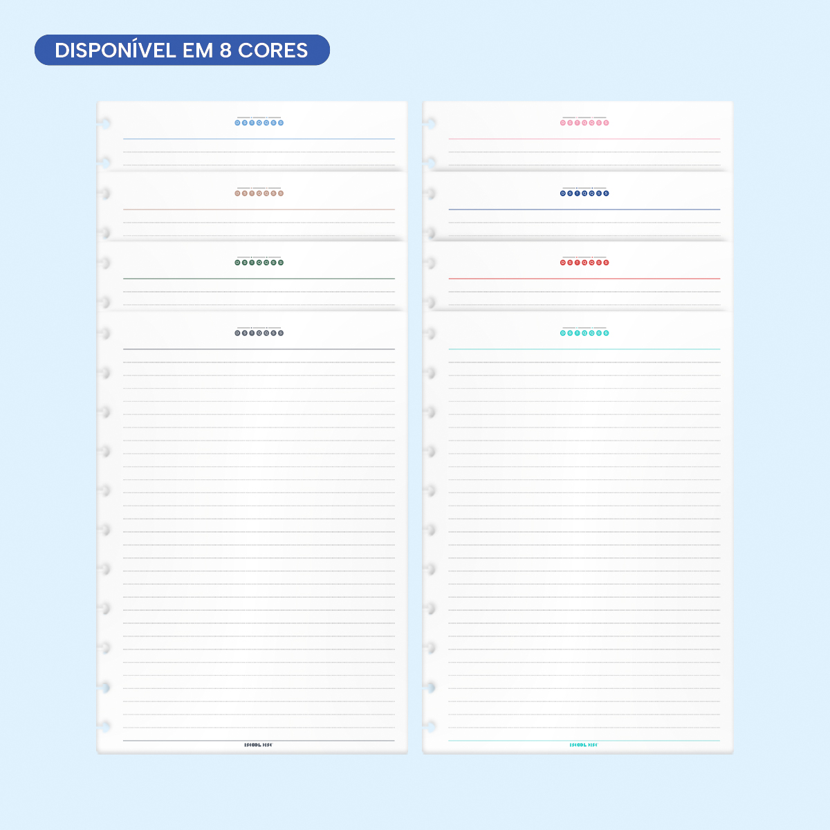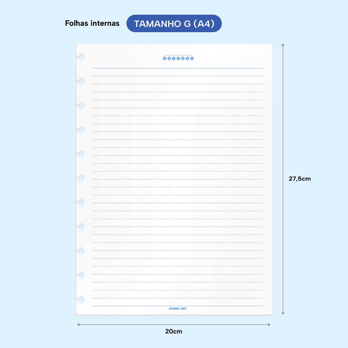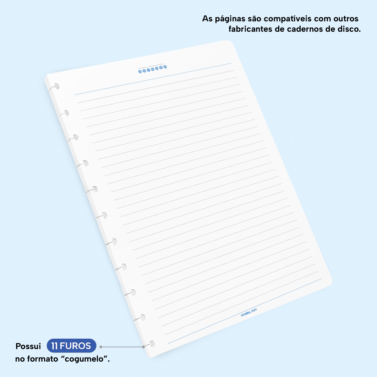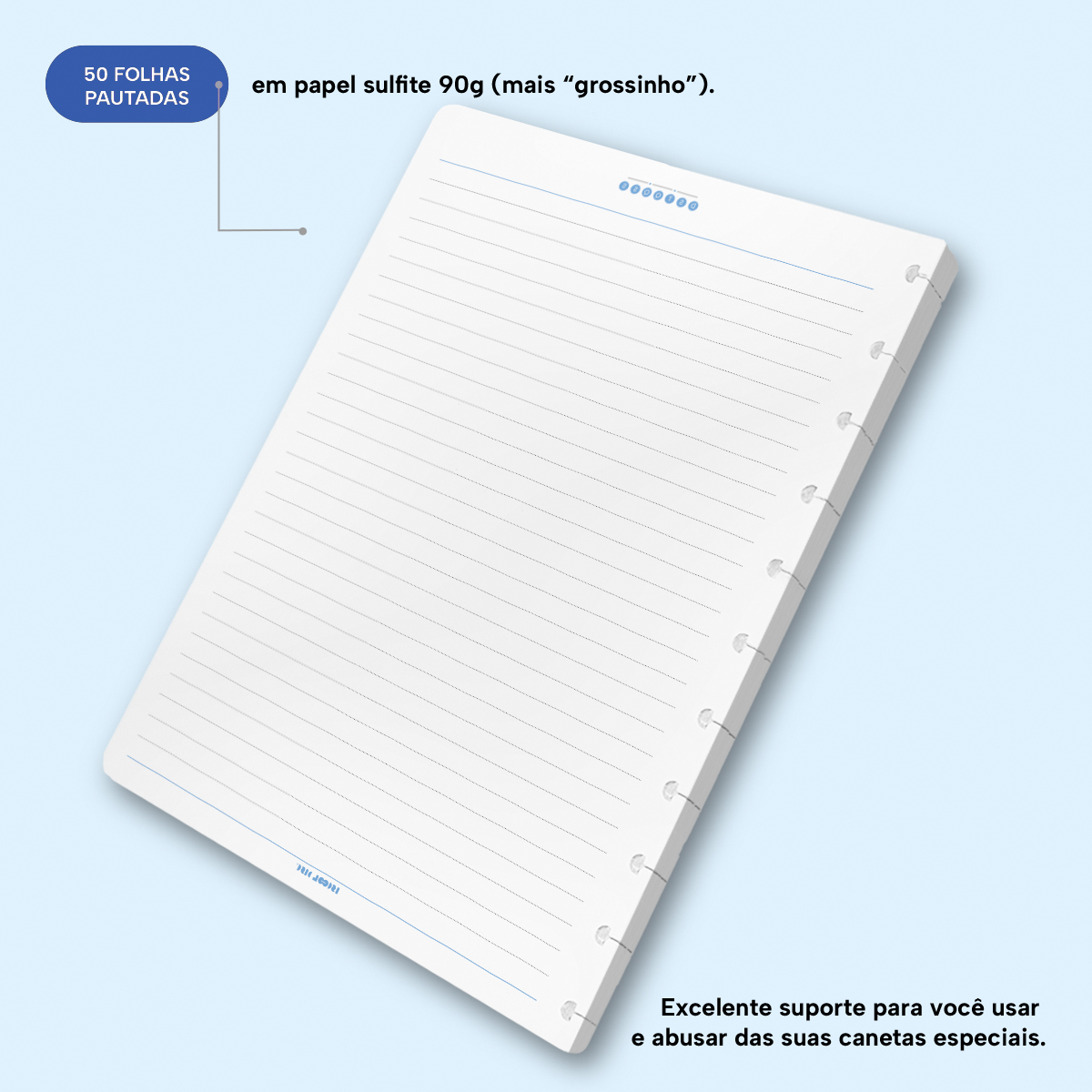 São 50 folhas pautadas no tamanho Grande 20 x 27,5 cm em papel sulfite/offset com gramatura de 90g, o papel mais “grossinho”, deixando rolar solta sua criatividade para utilizar suas canetas mais especiais! As folhas contêm 11 furos em formato de “cogumelo” proporcionando fácil encaixe e desencaixe nos discos, você livre pra montar seu caderno como quiser!