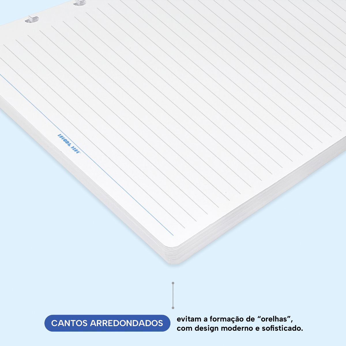 - Quantidade de folhas: 50 folhas pautadas com cantos arredondados.