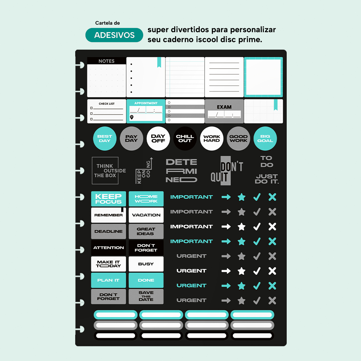 Acompanha ainda uma cartelinha de adesivos coloridos para você se divertir personalizando o seu caderno com a sua cara.