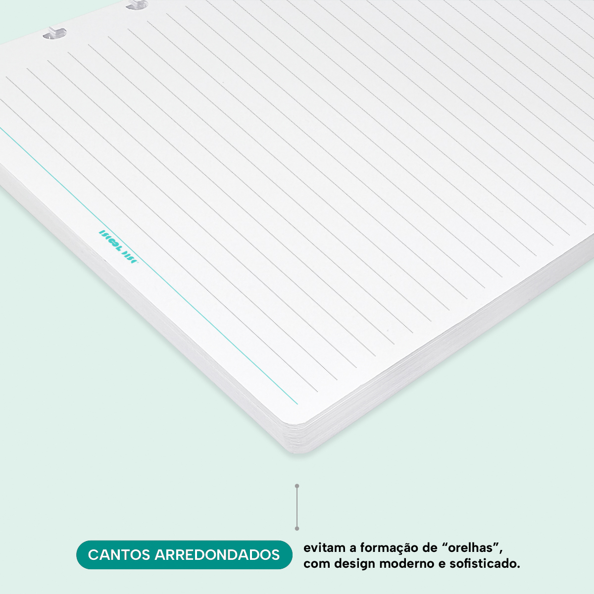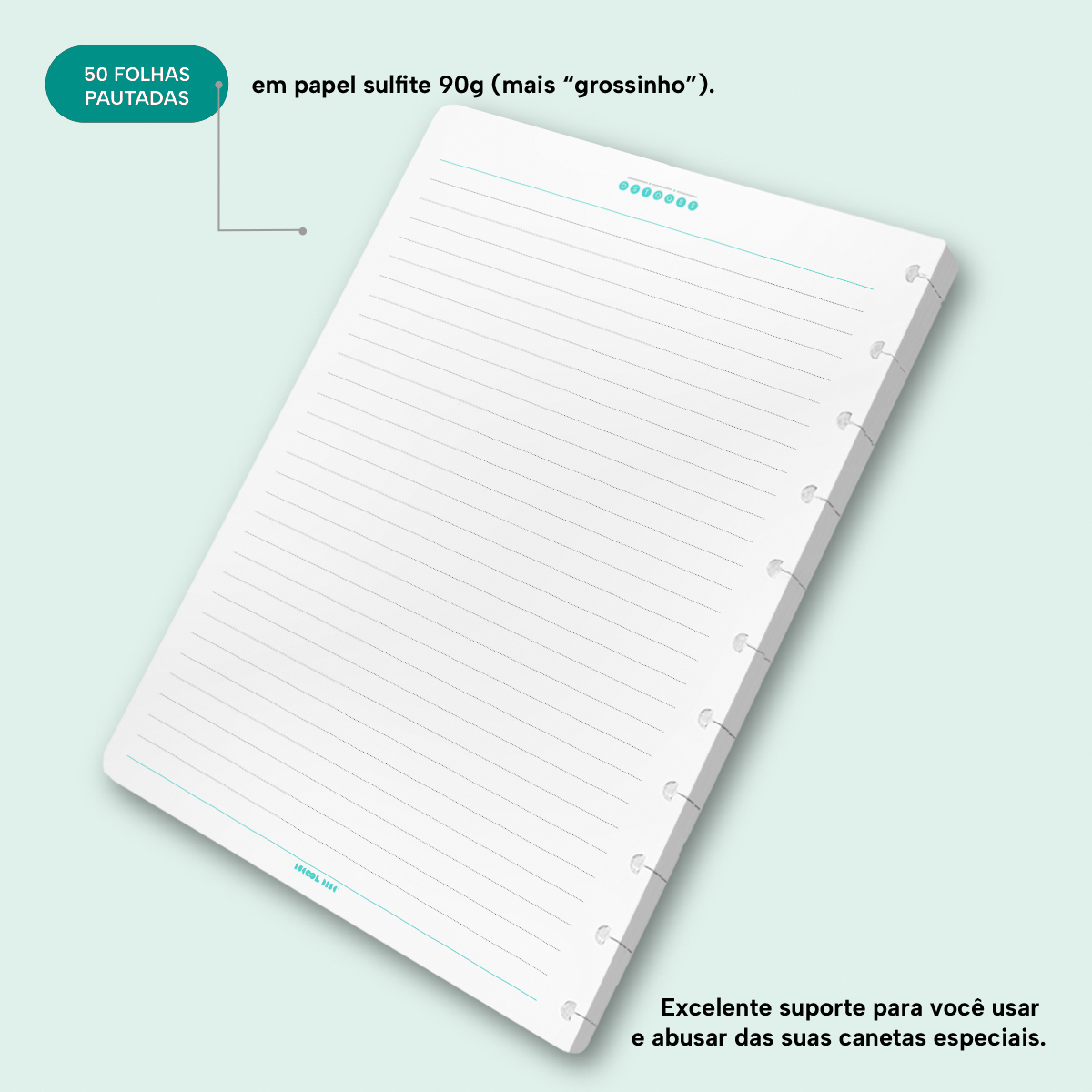 - Quantidade de folhas: 50 folhas pautadas com cantos arredondados.