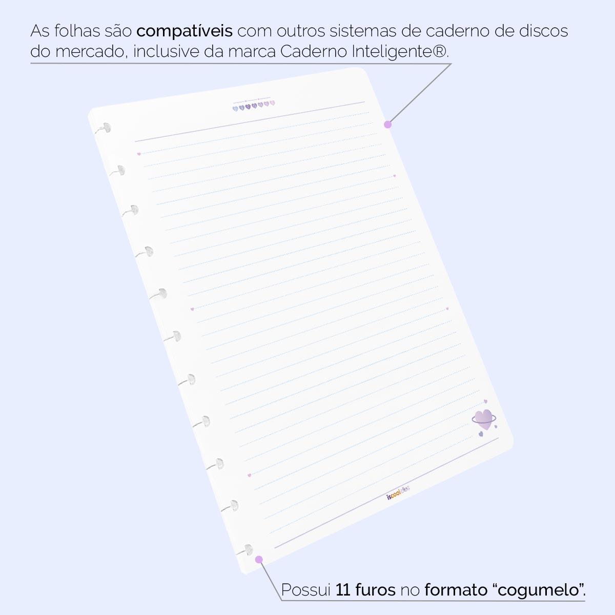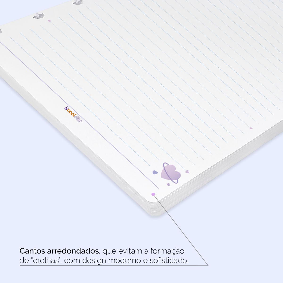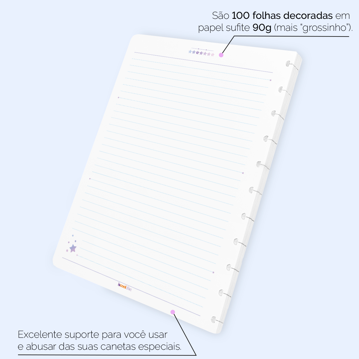 - Quantidade de folhas: 100 folhas pautadas decoradas com cantos arredondados.