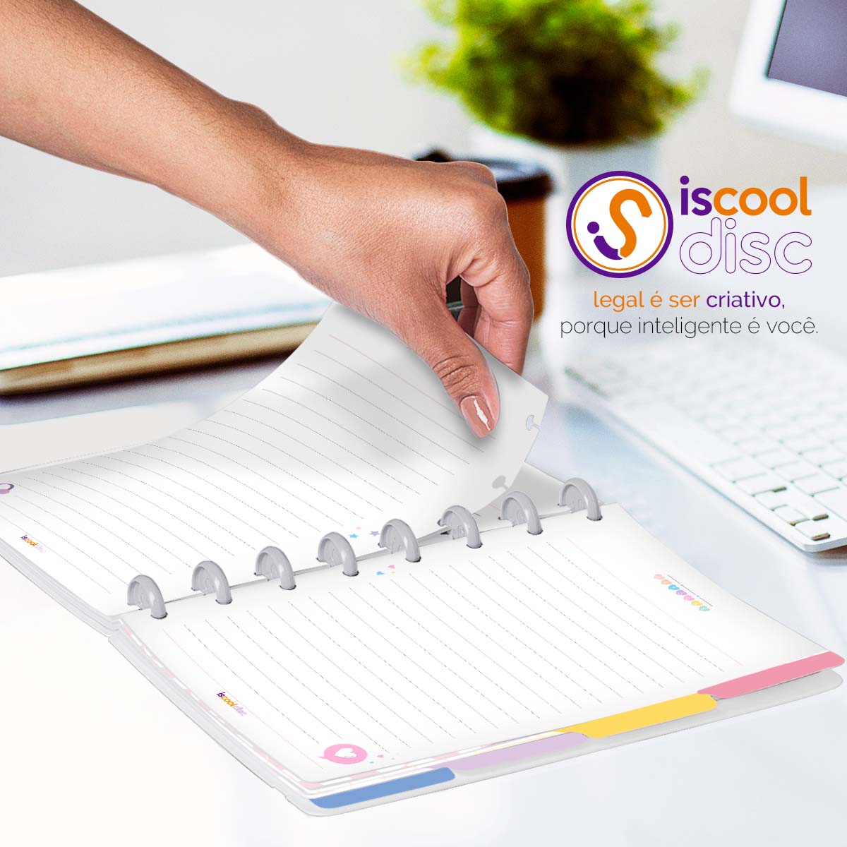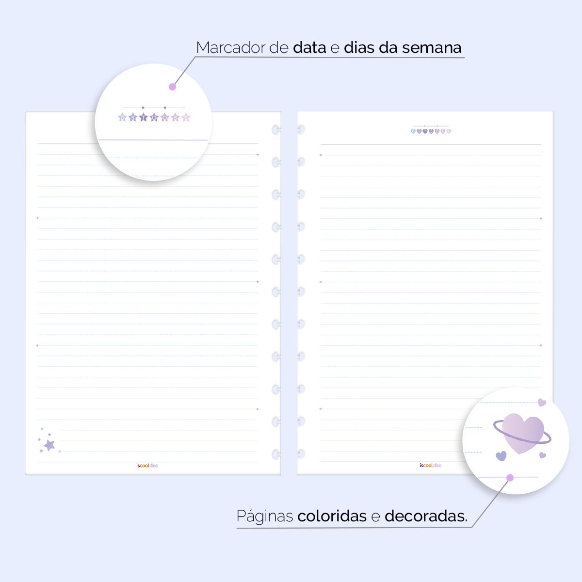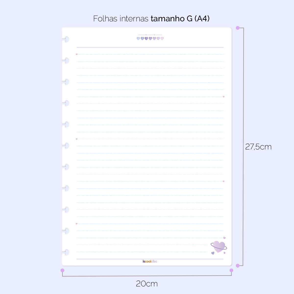 - Quantidade de folhas: 100 folhas pautadas decoradas com cantos arredondados.