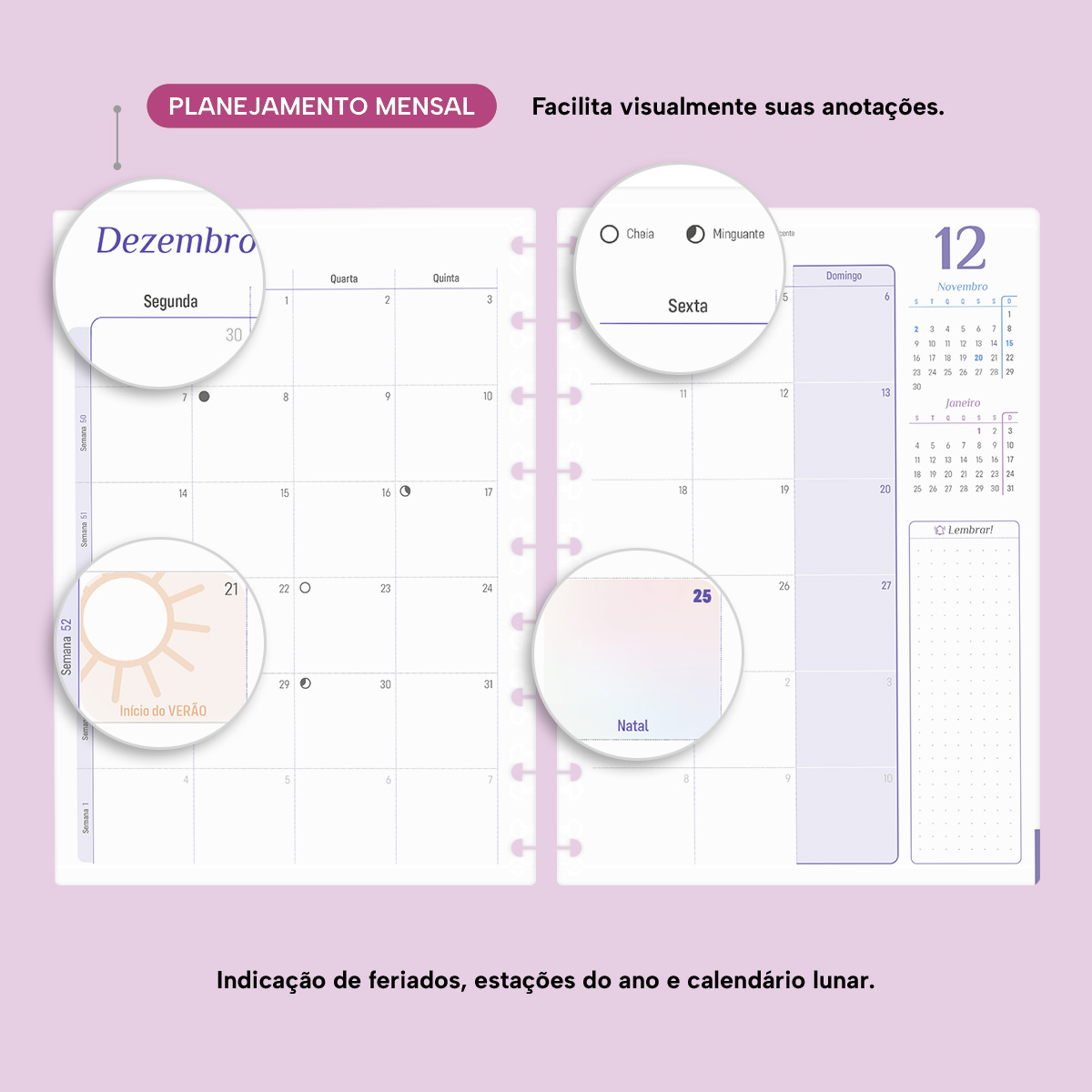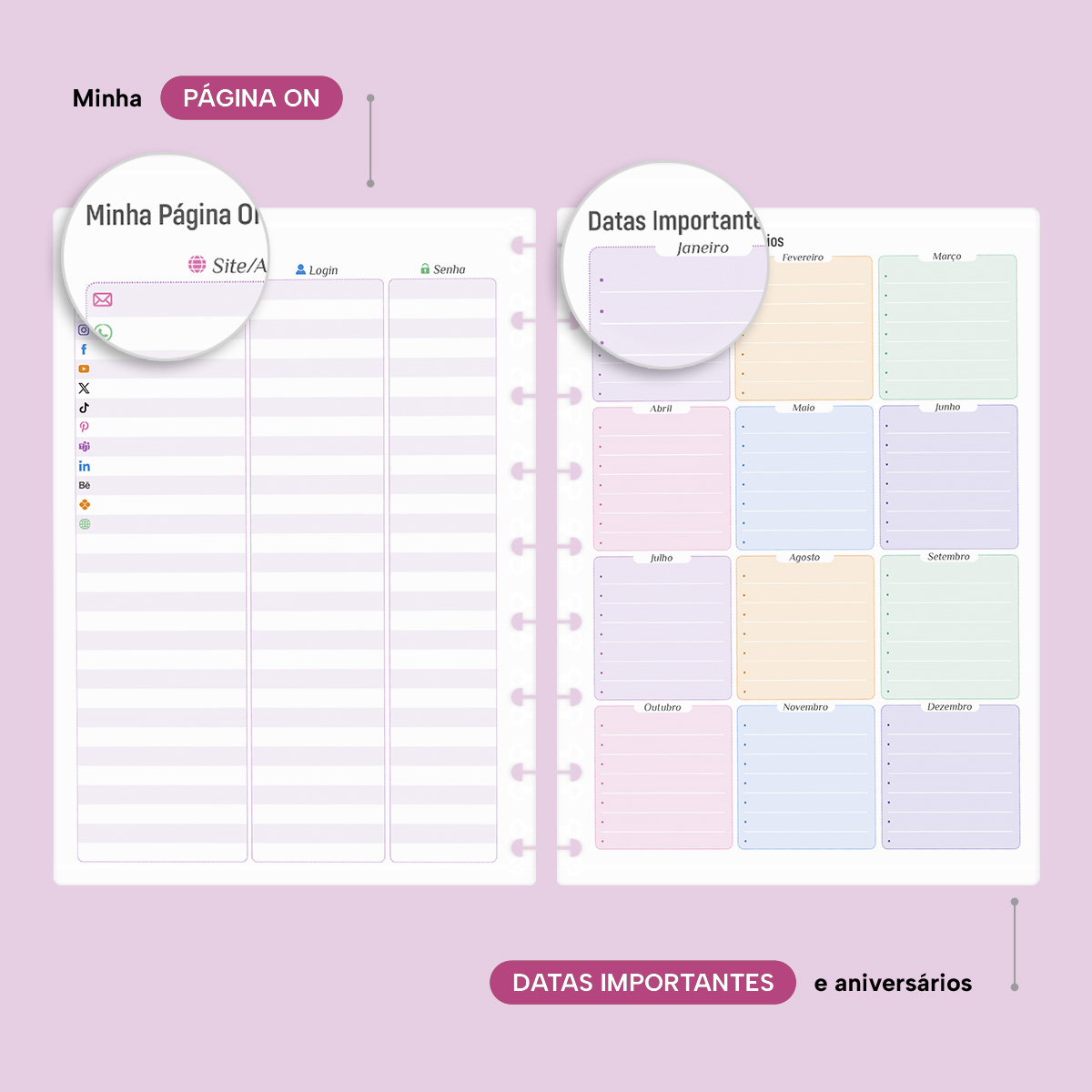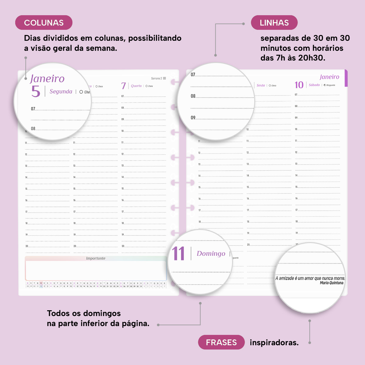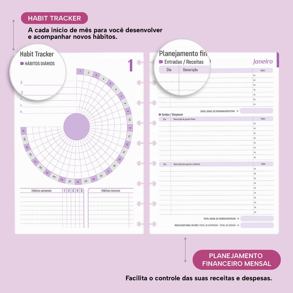 Os dias são divididos em colunas, permitindo uma visão geral da semana. No início de cada mês, há um planejamento mensal, facilitando a visualização das suas principais anotações, um Habit Tracker para desenvolver novos hábitos ou monitorar os mais importantes, além de um planejamento financeiro para ajudar no controle das suas receitas e despesas — entre muitas outras funcionalidades.