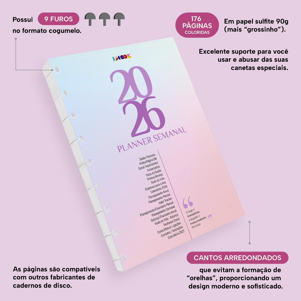 Com o nosso refil ISCOOL DISC Planner Datado 2026, você garante novas páginas para utilizar seu planner sempre que precisar, deixando-o novinho em folha!