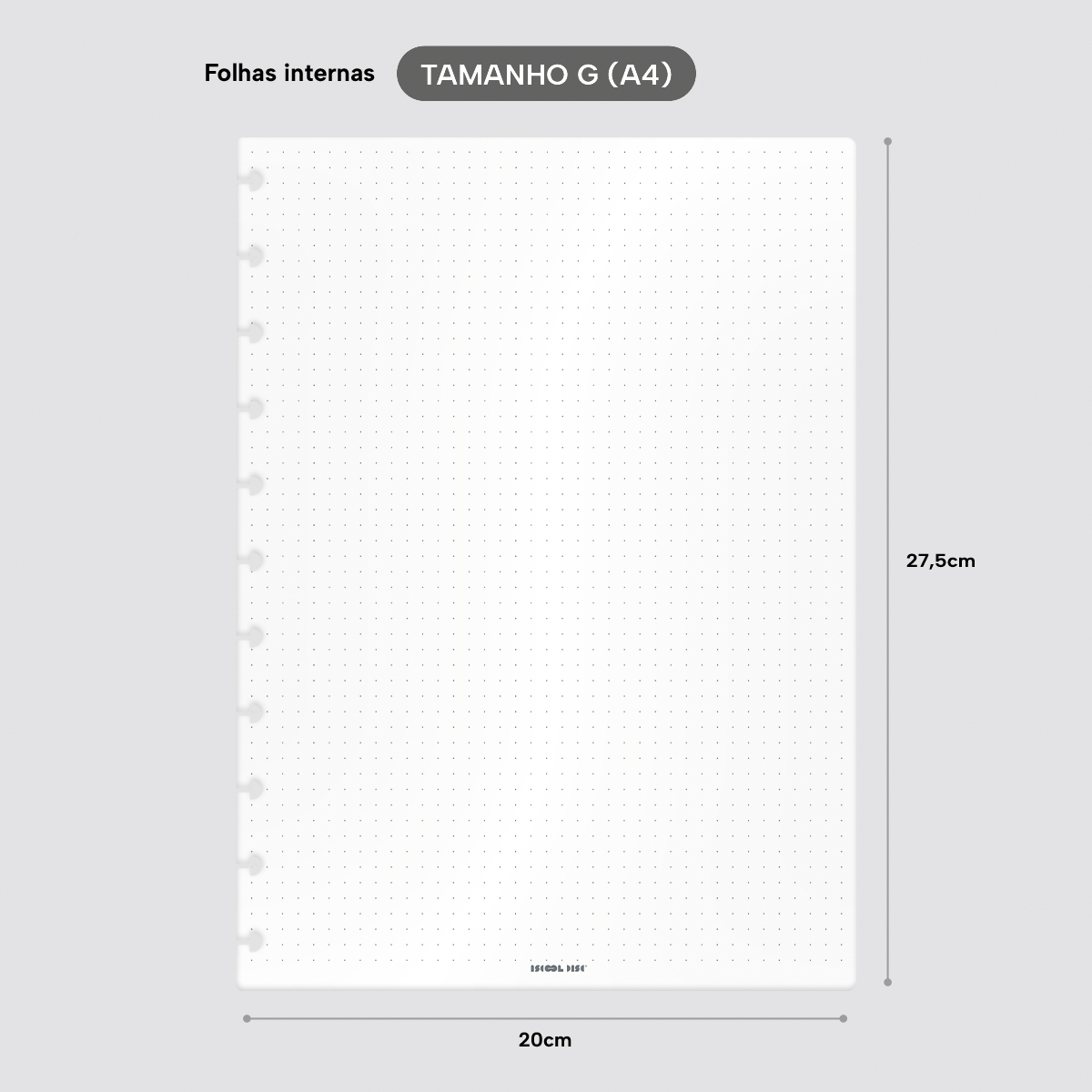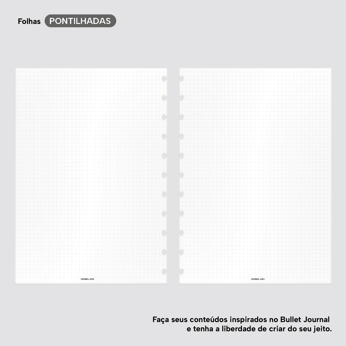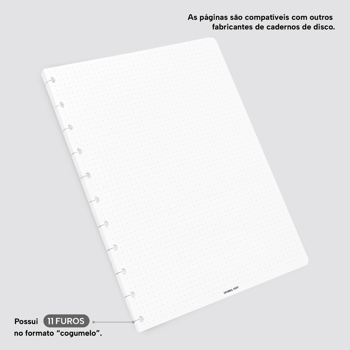 São 50 folhas pontilhadas no tamanho Grande 20 x 27,5 cm em papel sulfite/offset com gramatura de 90g, o papel mais “grossinho”, deixando rolar solta sua criatividade para utilizar suas canetas mais especiais! As folhas contêm 11 furos em formato de “cogumelo” proporcionando fácil encaixe e desencaixe nos discos, você livre pra montar seu caderno como quiser!