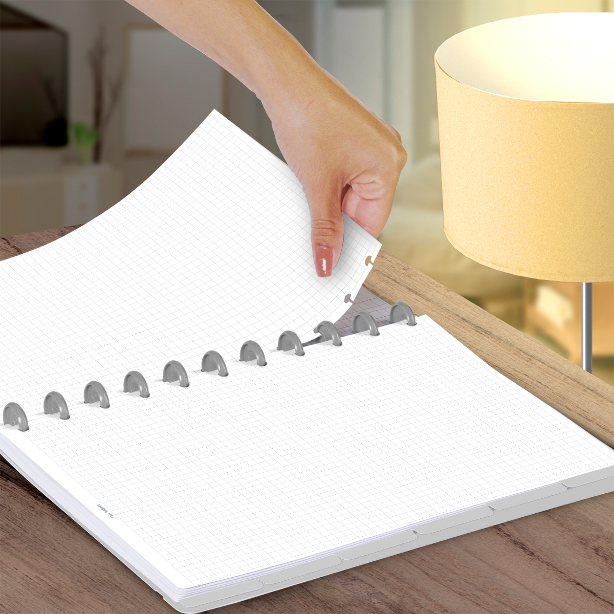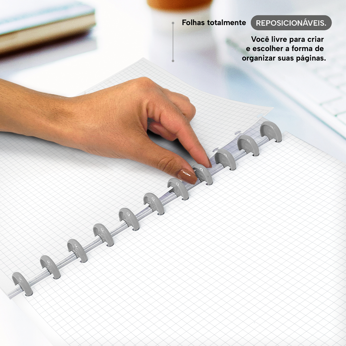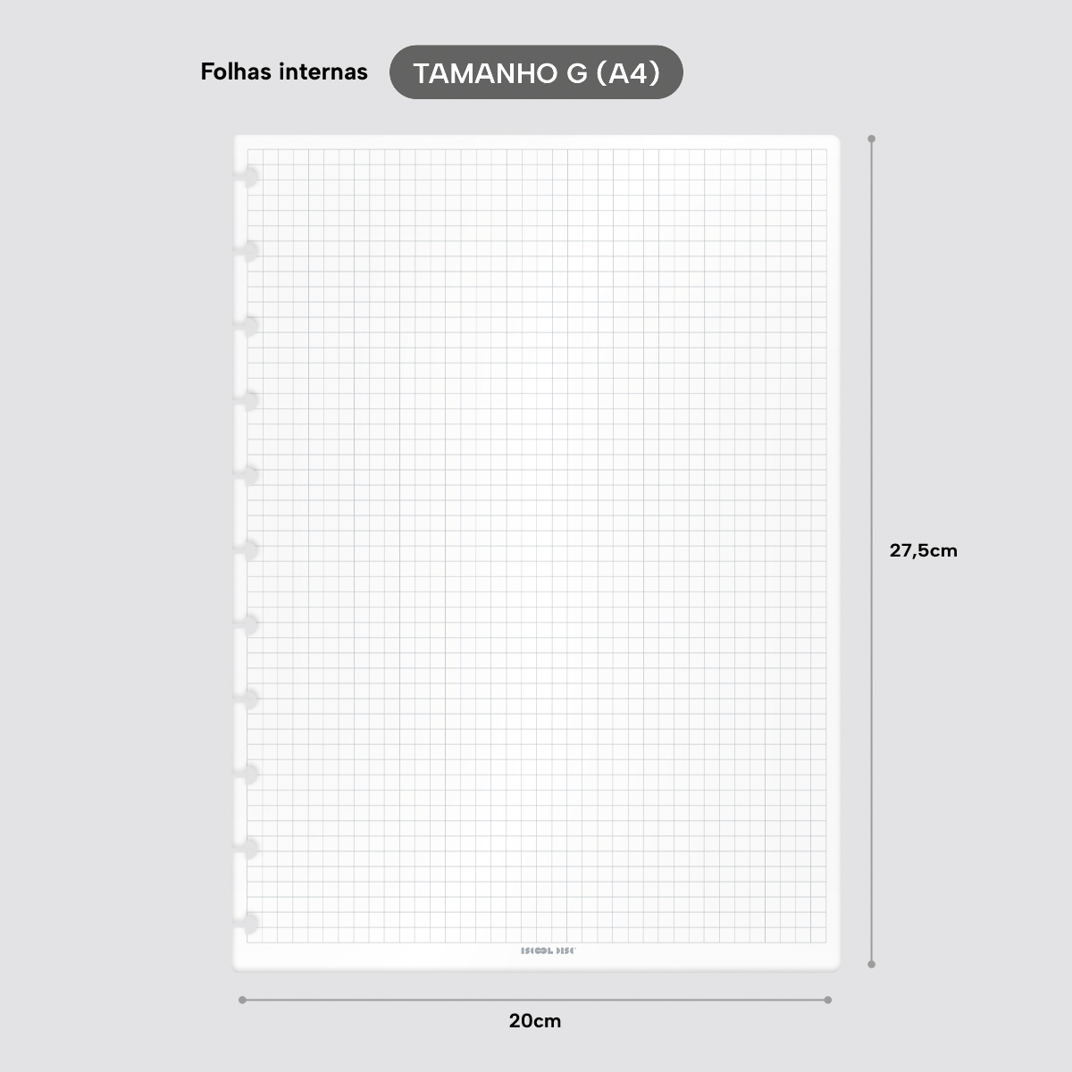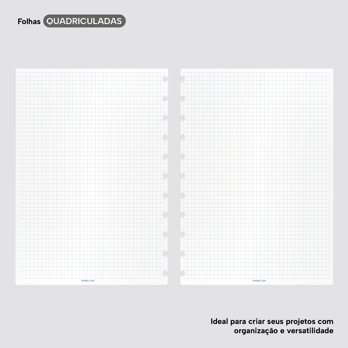 São 50 folhas quadriculadas no tamanho Grande 20 x 27,5 cm em papel sulfite/offset com gramatura de 90g, o papel mais “grossinho”, deixando rolar solta sua criatividade para utilizar suas canetas mais especiais! As folhas contêm 11 furos em formato de “cogumelo” proporcionando fácil encaixe e desencaixe nos discos, você livre pra montar seu caderno como quiser!
