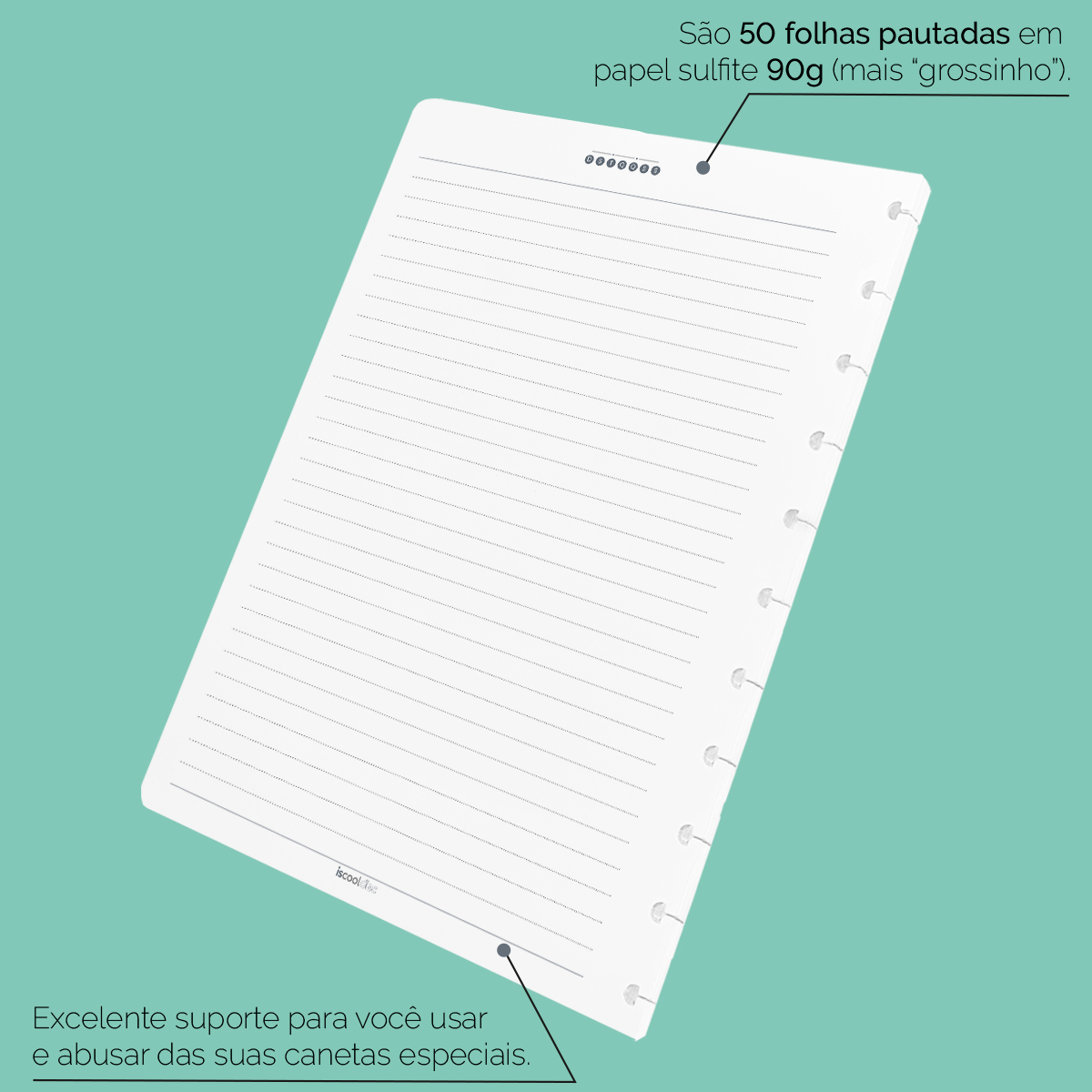 São 50 folhas pautadas no tamanho Grande 20 x 27,5 cm em papel sulfite/offset com gramatura de 90g, o papel mais “grossinho”, deixando rolar solta sua criatividade para utilizar suas canetas mais especiais! As folhas contêm 11 furos em formato de “cogumelo” proporcionando fácil encaixe e desencaixe nos discos, você livre pra montar seu caderno como quiser!