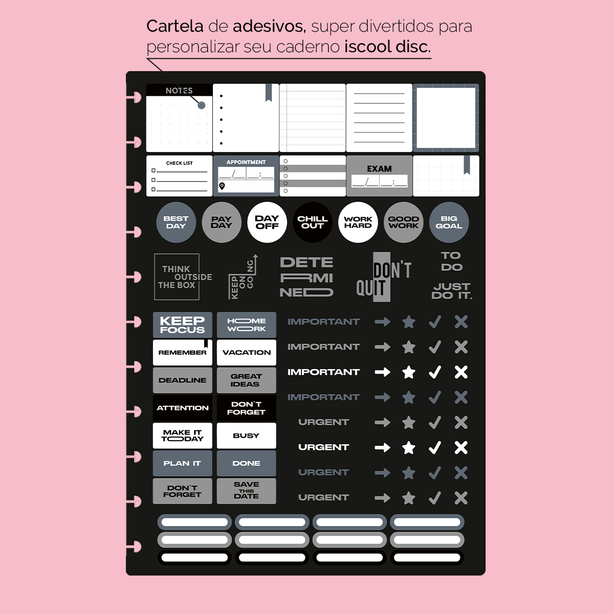 Acompanha ainda uma cartelinha de adesivos coloridos para você se divertir personalizando o seu caderno com a sua cara.