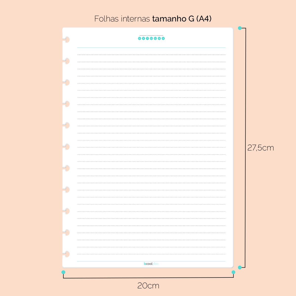São 50 folhas pautadas no tamanho Grande 20 x 27,5 cm em papel sulfite/offset com gramatura de 90g, o papel mais “grossinho”, deixando rolar solta sua criatividade para utilizar suas canetas mais especiais! As folhas contêm 11 furos em formato de “cogumelo” proporcionando fácil encaixe e desencaixe nos discos, você livre pra montar seu caderno como quiser!