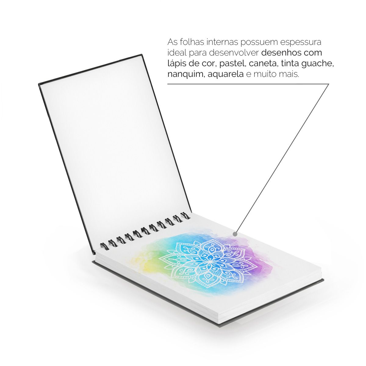 Na medida de 15x21 cm (A5), ele possui 50 folhas (100 páginas) em papel branco alcalino (acid free) e gramatura de 180g/m². As folhas internas possuem espessura ideal para desenvolver desenhos com lápis de cor, pastel, caneta, tinta guache e até nanquim!