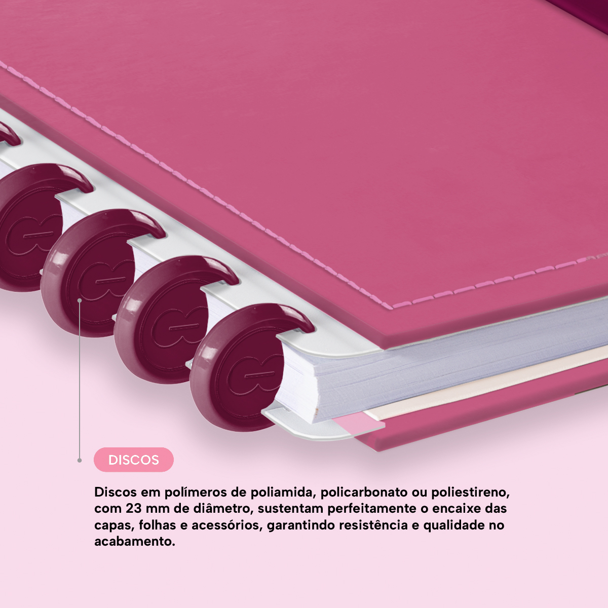 Encadernado com 11 discos M de 23mm em polímero de nylon e/ou policarbonato coloridos, fabricados no Brasil.